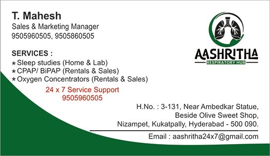 AASHRITHA RESPIRATORY HUB is a leading sleep clinic and medical equipment supplier in Hyderabad, Telangana. Specializing in respiratory health, we offer comprehensive services including in-home and laboratory sleep studies to diagnose and manage sleep-related conditions. Our wide range of medical supplies includes CPAP, BiPAP, and oxygen concentrators available for both rental and sale, providing flexible options to meet your needs. We are dedicated to supporting your health and well-being with reliable equipment and professional care, ensuring you have the support you need, whenever you need it.
